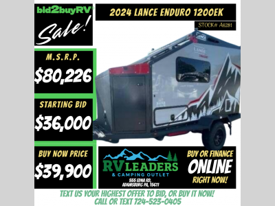 Sale prices listed excludes state taxes, tag fees, title fees, registration fees, government fees, dealer prep/PDI fees (optional for certain RVs) and delivery fees (optional service). The sale price includes an additional $1500 discount for financing with RV Leaders, cash deals or customer arranged financing will require this discount to be added back to the sale price. Monthly payments are an estimate for illustrative purposes only. They are not an advertisement or offer. Monthly payments may differ based on down payment, terms, special offers or other fees. You must apply and qualify for approved credit.