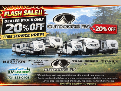 RV Leaders & Camping Outlet works hard to ensure the accuracy of our RV unit listings and website pages. Content (this includes prices) for RV unit listings and website pages can change without notice. Manufacturer specifications, features, equipment, technical data, photos (stock photos as well) and illustrations may be used in place of our RV unit listings and website pages. Manufacturer specifications, features, equipment, technical data, photos (stock photos as well) and illustrations are based on information available at the time of publishing. We are not responsible for any misprints, typos or errors found on our RV unit listings and website pages.