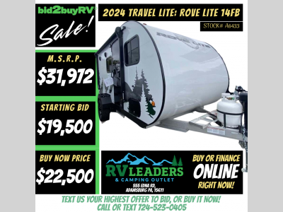 Sale prices listed excludes state taxes, tag fees, title fees, registration fees, government fees, dealer prep/PDI fees (optional for certain RVs) and delivery fees (optional service). The sale price includes an additional $1500 discount for financing with RV Leaders, cash deals or customer arranged financing will require this discount to be added back to the sale price. Monthly payments are an estimate for illustrative purposes only. They are not an advertisement or offer. Monthly payments may differ based on down payment, terms, special offers or other fees. You must apply and qualify for approved credit.