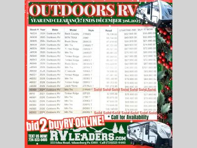 RV Leaders & Camping Outlet works hard to ensure the accuracy of our RV unit listings and website pages. Content (this includes prices) for RV unit listings and website pages can change without notice. Manufacturer specifications, features, equipment, technical data, photos (stock photos as well) and illustrations may be used in place of our RV unit listings and website pages. Manufacturer specifications, features, equipment, technical data, photos (stock photos as well) and illustrations are based on information available at the time of publishing. We are not responsible for any misprints, typos or errors found on our RV unit listings and website pages.